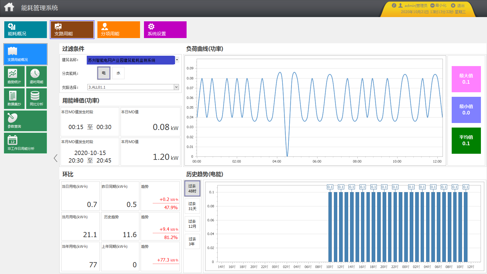 系統可以統計各分項某段時間內逐日、逐周、逐月、逐季、逐年用能。可查看分項中各支路用能趨勢,可根據已有的日期或者自定義時間進行查詢,統計數據可導出至Excel。
