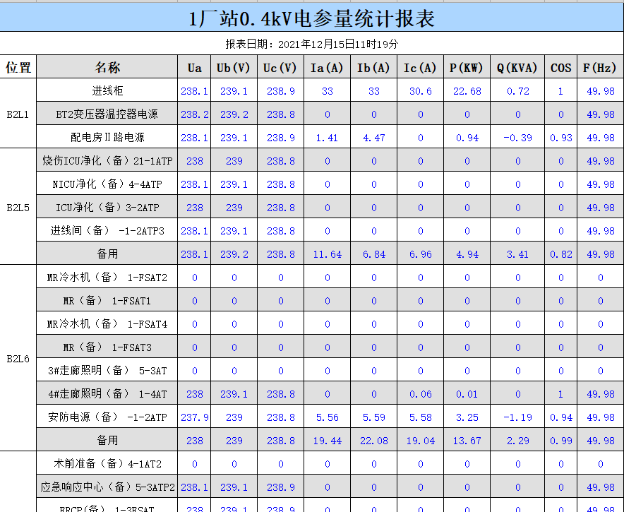 參數抄表功能,主要對低壓各出線回路的電參數進線查詢。支持任意時刻電參數查詢,具備數據導出和報表打印等功能。該報表查詢配電箱出線回路的電參數,主要包括:三相電壓、電流、功率因數、有功功率和有功電度。該報表各回路名稱和數據庫關聯,方便用戶修改回路名稱。見圖(4)。