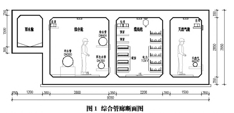 西安市某新區南北三號路綜合管廊為該區先期啟動建設的管廊之一,位于道路非機動車道及人行道下,全長約1.1km。收納的管線包括電力、通信、給水、再生水、污水、雨水、天然氣,設有綜合艙、纜線艙、天然氣艙、雨水艙,采用鋼筋混凝土結構,詳見圖1。