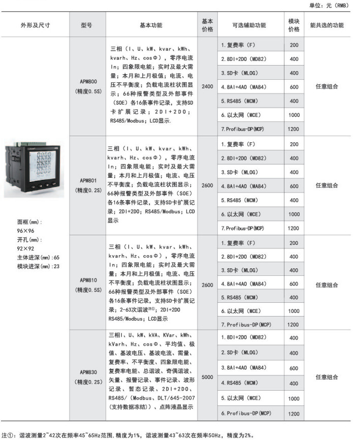 APM系列網絡電力儀表按IEC標準設計,具有全電量測量,電能統計,電能質量分析及網絡通訊等功能,主要用于對電網供電質量的綜合監控診斷及電能管理。該系列儀表采用了模塊化設計,當客戶需要增加開關量輸入輸出,模擬量輸入輸出,SD卡記錄,以太網通訊時,只需在背部插入對應模塊即可。