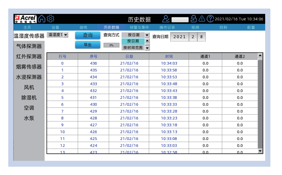 進入“歷史數據”界面,首先顯示的溫濕度設備的歷史數據表格,同“設備查看”界面一樣,左邊有設備列表,點擊列表上的不同設備名稱可以查看對應設備的由實時及歷史的監測數據形成的歷史數據表格表格上方的查詢及導出按鈕分別提供相應的查詢和導出功能,并且可以根據所選擇的不同查詢方式進行不同方式的查詢功能。