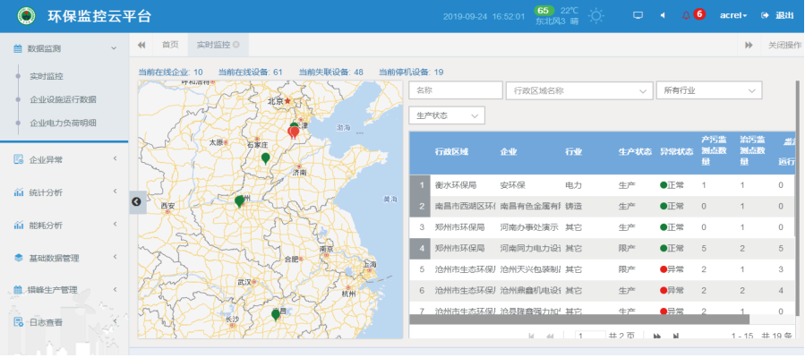 企業(yè)設(shè)施運行數(shù)據(jù):展示接入平臺的生產(chǎn)點位以及關(guān)聯(lián)的治理點位各個時間點的數(shù)據(jù)上報情況。