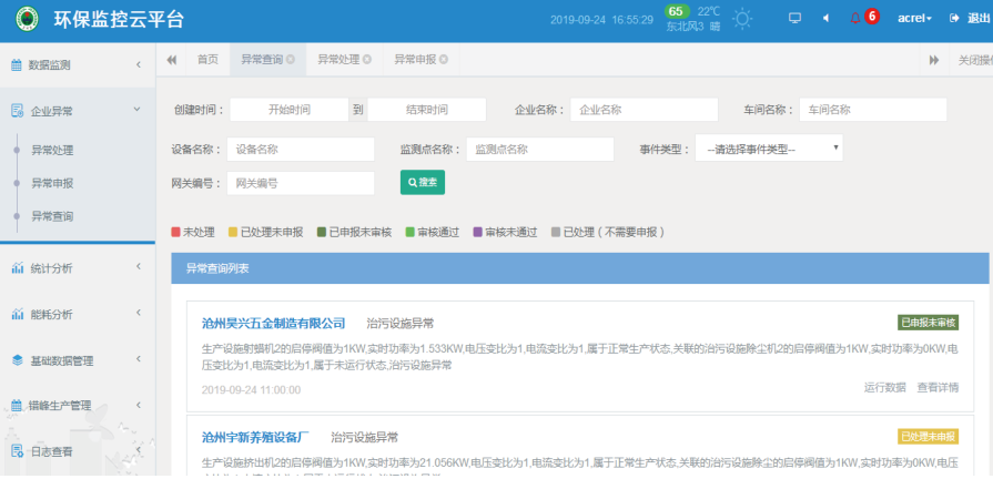 通過關(guān)聯(lián)分析、超限分析、啟停時間分析,及時發(fā)現(xiàn)環(huán)保治理設(shè)備未開啟、異常關(guān)閉及減速、空轉(zhuǎn)、降頻等異常情況,同時通過數(shù)據(jù)分析還可以實時監(jiān)控限產(chǎn)和停產(chǎn)整治企業(yè)運行狀態(tài),如圖所示: