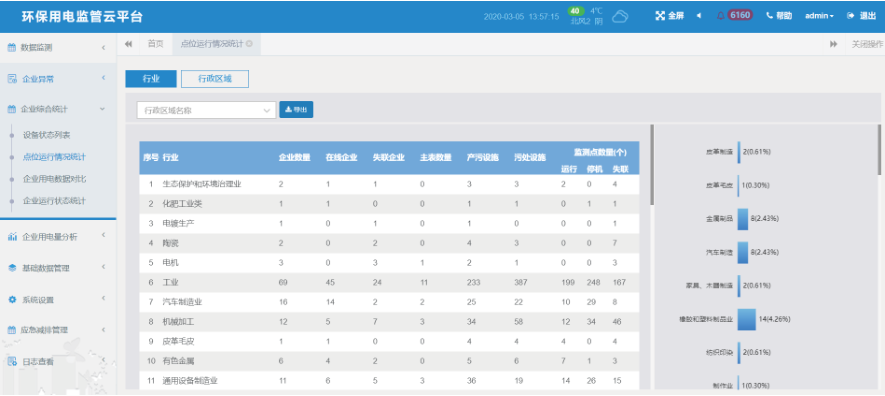 點位運行情況分析:按行業(yè)或區(qū)域統(tǒng)計分析企業(yè)、監(jiān)測點、產(chǎn)污設(shè)施、治污設(shè)施等數(shù)量及運行狀態(tài)。